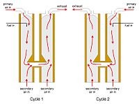 These typically consist of a pair of shafts, operated alternately. Fitst ,when shaft A is the "primary" and B the "secondary" shaft, the combustion air is added from the top of shaft A, while fuel somewhat below via burner lances. The flame is top-buttom. The hot gases pass downward, cross to shaft B via the so called "channel" and pass upward to exhaust of shaft B. At same time in both shafts cooling air is added from the buttom to cool the lime and to make exhaust of gases via the buttom of the kiln impossible via maintaining always a positive pressure. The combustion air and cooling air leave the kiln jointly via exhaust on top of shaft B, preheating the stone. The direction of flow is reversed periodically (typically 5-10 times per hour) shaft A and B changing the role of "primary" and "secondary" shaft. The kiln has three zones: preheating zone on the top, butning zone in the middle, and cooling zone close to the buttom. The cycling produces a long burning zone of constant, relatively low temperature (around 950°C) that is ideal for the production of high quality soft burned reactive lime. With exhaust gas temperatures as low as 120c° and lime temperature at kiln outlet in 80c° range the heat loss of the regenerative kiln is minimal , fuel consumption is as low as 3,6 MJ/kg. Due to these features the regenerative kilns are today mainstream technology under conditions of substantial fuel costs. Regenerative kilns are built with 150 to 800 t/day output, 300 to 450 being typical.